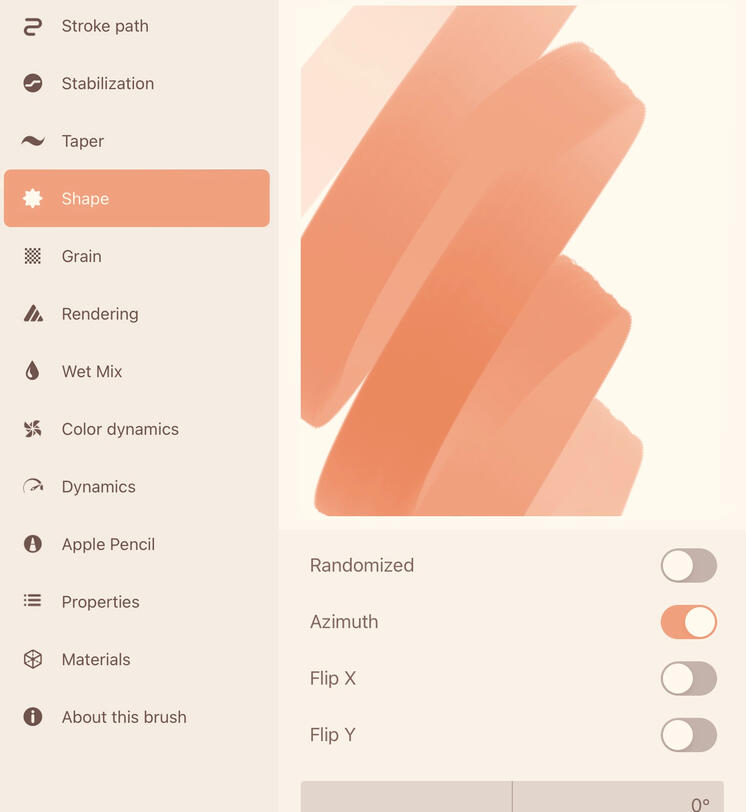 this brush has been personalised by turning the azimuth on in the brush settings. this is so the brush strokes are fixed in one direction.